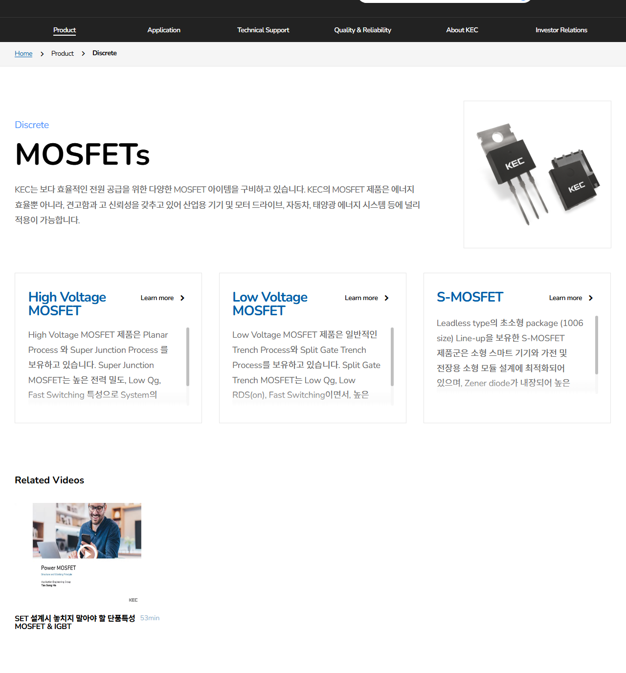 -내용 : 차세대 전력반도체 기업 KEC가 국내외 기관과의 계약을 통해 SiC MOSFET 사업화를 가속하고 있다. 회사는 트렌치형과 플래너형 SiC MOSFET을 모두 개발하는 독자적 역량을 보유하며, 제조 공정의 70%를 자체 확보하고 30%는 부산테크노파크에 위탁하고 있다. 대만 및 일본의 양산 역량 보유 기업들과도 사업 협력을 추진 중이다.