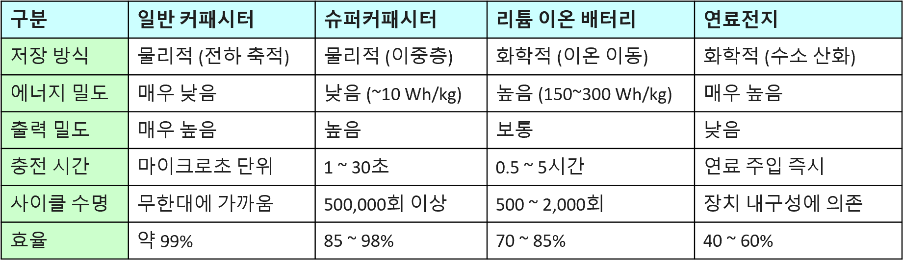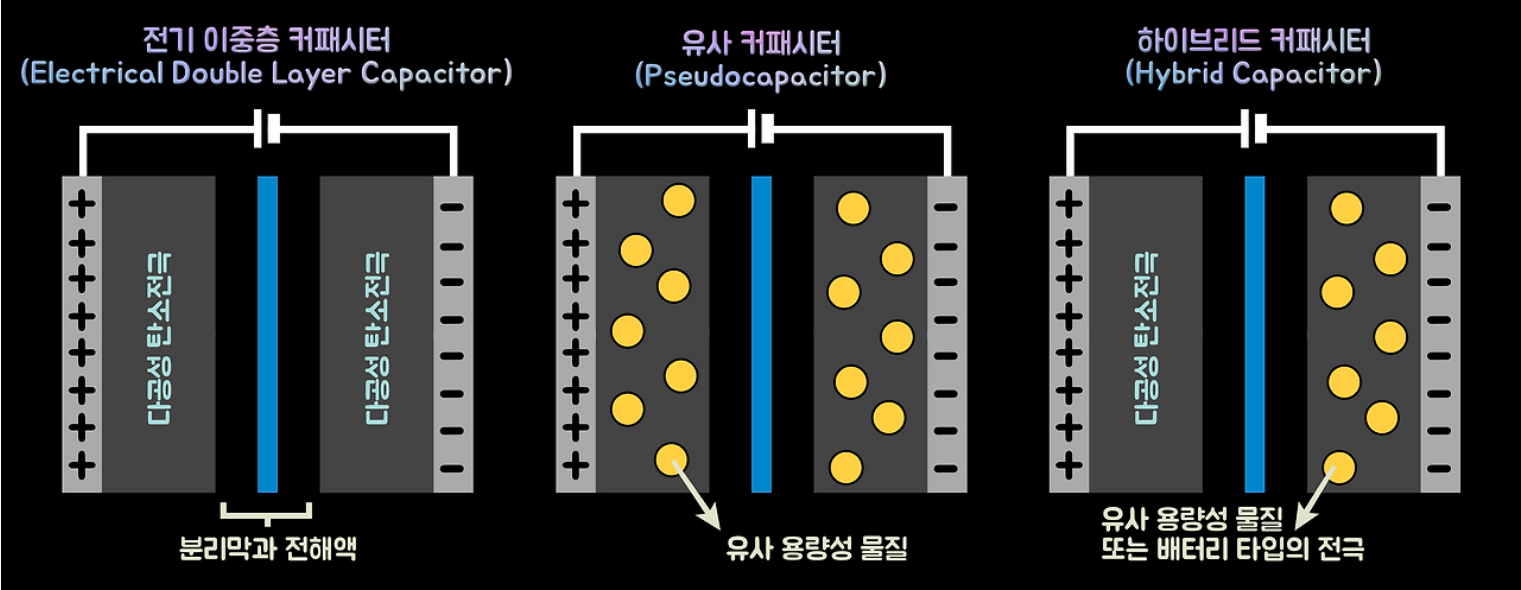 - 특징: 화학 반응이 없으므로 반응 속도가 매우 빨라 순간적으로 큰 힘을 낼 수 있고, 전극 손상이 거의 없어 반영구적으로 사용할 수 있습니다. 다만, 표면적에만 에너지를 저장하므로 배터리에 비해 저장량은 적습니다.