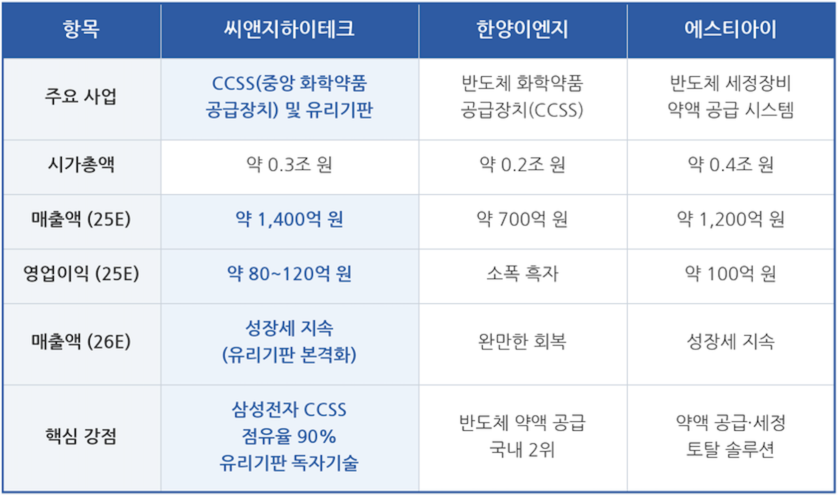 반도체 화학 약품 공급 장치(CCSS) 분야에서 씨앤지하이테크의 경쟁사로는 한양이엔지, 티이엠씨씨엔에스 등이 있으며, 오션브릿지도 동일 영역에서 먼저 상장한 선행 업체입니다. 그러나 이들 경쟁사가 순수 장비 공급에 집중하는 것과 달리, 씨앤지하이테크는 SC-1 중앙 공급 장치, FOS(DSP+) 중앙 공급 장치, Slurry Renewal System 등을 삼성전자와의 JDP(공동개발프로그램) 방식으로 개발하며 고객사 밀착형 기술 파트너십을 구축했습니다. 신성장 영역인 유리기판 분야에서는 SKC(앱솔릭스), 삼성전기, LG이노텍, 필옵틱스, 켐트로닉스 등과 경쟁 구도를 형성하고 있으나, 씨앤지하이테크는 글라스 PCB 기판 제조 핵심 기술에 대한 특허를 보유하고 있으며 삼성전자와 반도체 제조 장비 공급계약을 체결한 이력을 갖추고 있어 고객사 신뢰도 면에서 차별적 우위를 보입니다.