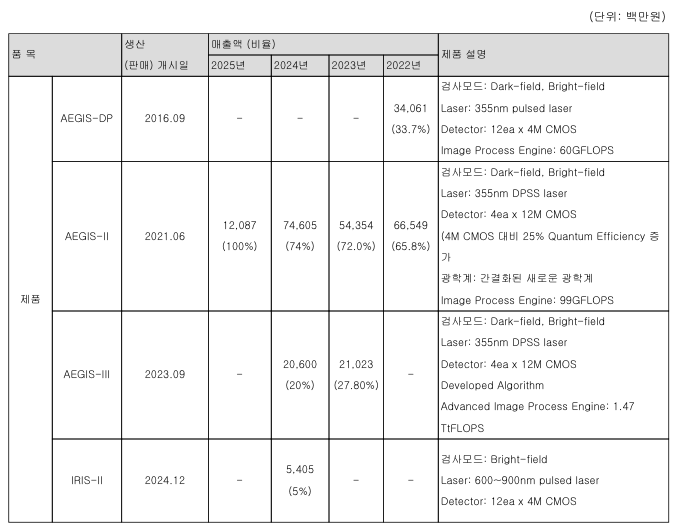 ▶ 패턴 결함 검사 시스템 : 반도체 회로 패턴의 결함을 검출하는 광학 검사 솔루션을 제공하며, 고해상도 이미지 분석 기술과 자체 알고리즘을 기반으로 공정 수율 향상에 기여합니다. 주요 고객사는 글로벌 메모리 및 파운드리 반도체 기업입니다.