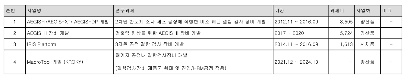 ▶ 차세대 반도체 검사 기술 개발 : 미세 공정 및 첨단 반도체 구조에 대응하기 위해 고해상도 광학 검사 기술, 결함 분석 알고리즘, 차세대 검사 장비 플랫폼을 지속적으로 개발하고 있습니다. 이를 통해 메모리 반도체뿐 아니라 파운드리 및 첨단 공정 분야로 사업 영역을 확장하고 있습니다.