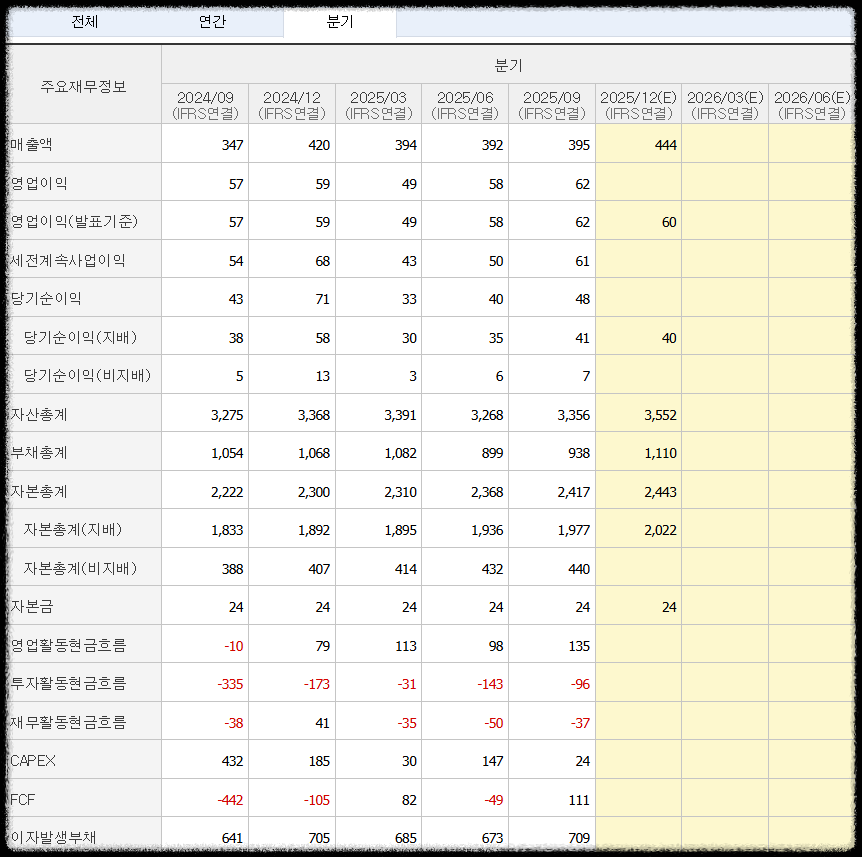 부채 의존도가 매우 낮은 건전한 재무구조. 약 1,600억원 규모의 과천 센터를 자체 자금으로 구축한 점은 재무 안정성의 증거다.
