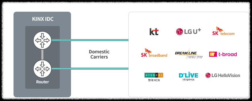 다양한 회선 사업자와 연동된 인터넷 연동 회선 서비스. 원하는 회선 사업자의 트랜짓을 자유롭게 구매 가능 → KINX 트랜짓
