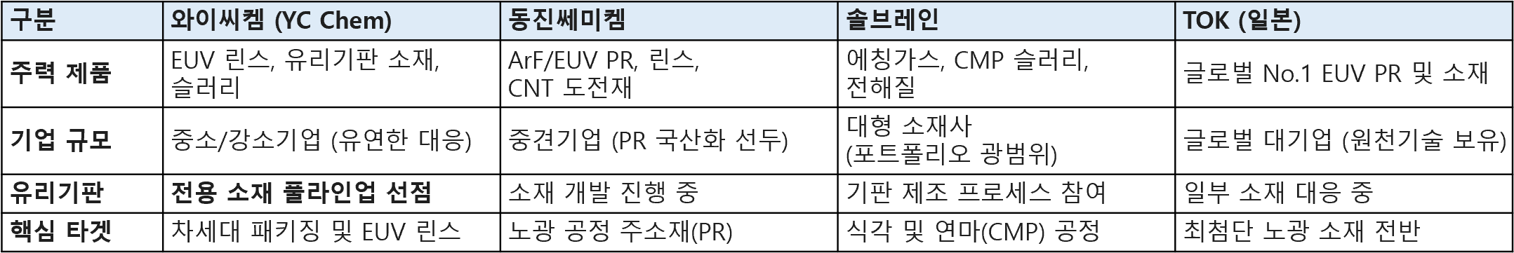 ▶ 차별점: 동진쎄미켐이나 솔브레인이 기존의 PR(감광액)이나 에칭가스 등 '메인 공정' 소재에 집중할 때, 와이씨켐은 차세대 패키징인 유리기판용 소재(TMMF, 박리액 등)를 세계 최초로 개발하며 시장을 선점했습니다.