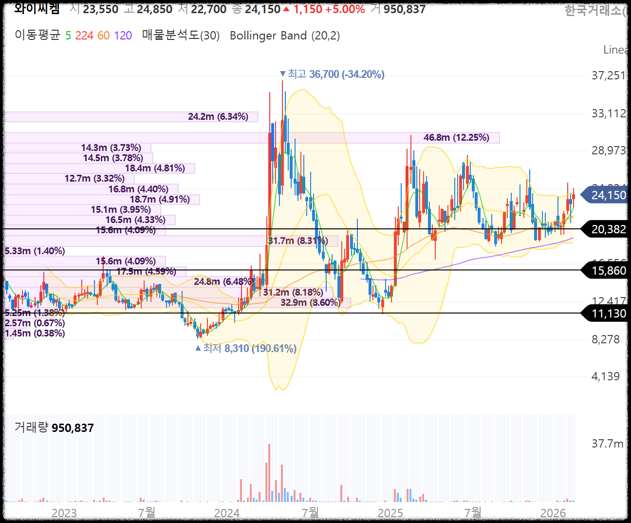 ▶ HBM 시장 수혜 : 시장이 단순 테마주를 넘어 실제 실적 연결 가능성을 따지는 가운데, 와이씨켐은 HBM 미세공정 고도화 과정에서의 적용 가능성이 부각되며 긍정적인 평가를 받았습니다.