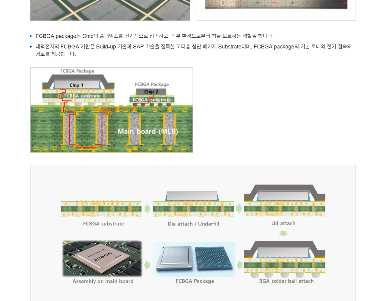 ▶ 타사 대비 차별점 : 국내에서 100mm급 대면적 FC-BGA를 양산 가능한 업체는 삼성전기와 대덕전자 등 극소수이며, 50년 이상의 PCB 제조 노하우를 바탕으로 미세회로 구현과 대면적 기판의 휨(warpage) 제어 기술에서 차별화된 경쟁력을 보유하고 있습니다.