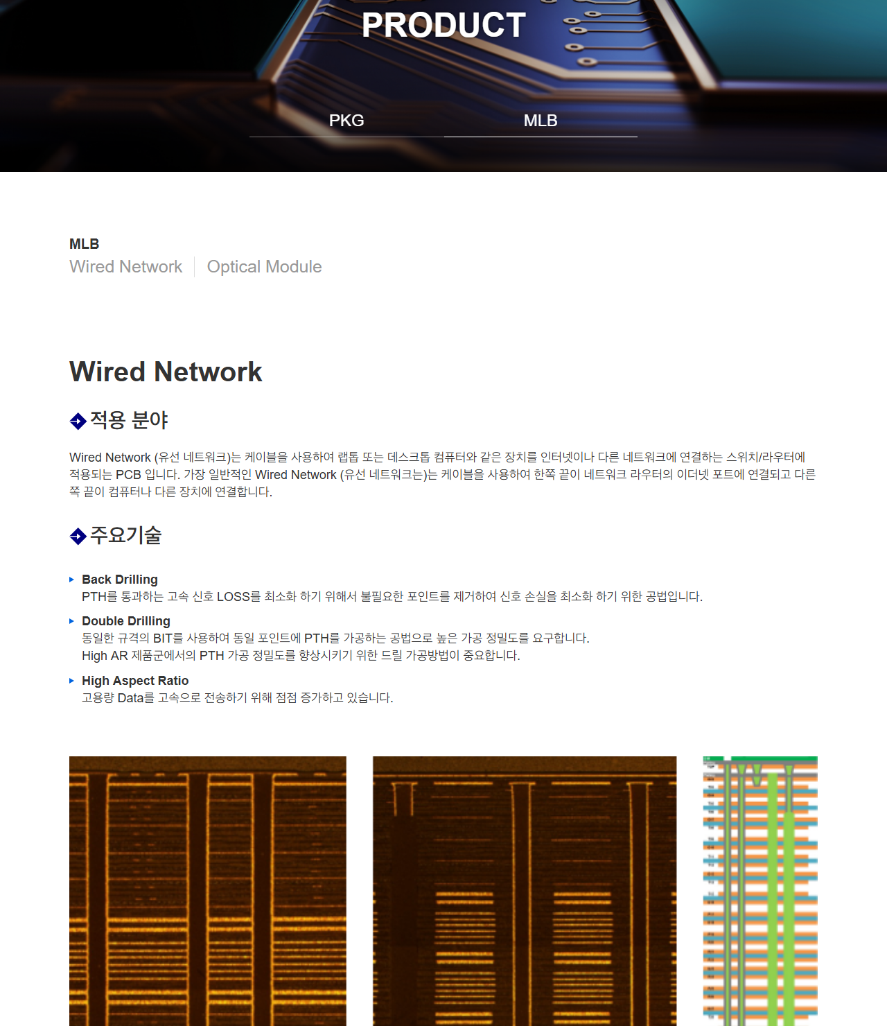 ▶ AI 가속기용 고다층 MLB 제조 기술 : 30층 이상의 초고적층 MLB를 제조하는 기술로, AI 가속기의 대용량 데이터 전송과 고속 신호 전달을 지원합니다. HDI(고밀도 인터커넥트) 기술력을 MLB에 접목하여 빌드업 공정이 필요한 OAM 보드까지 제작이 가능합니다.