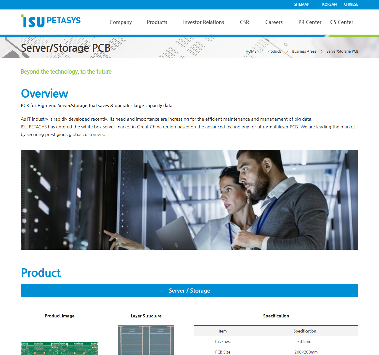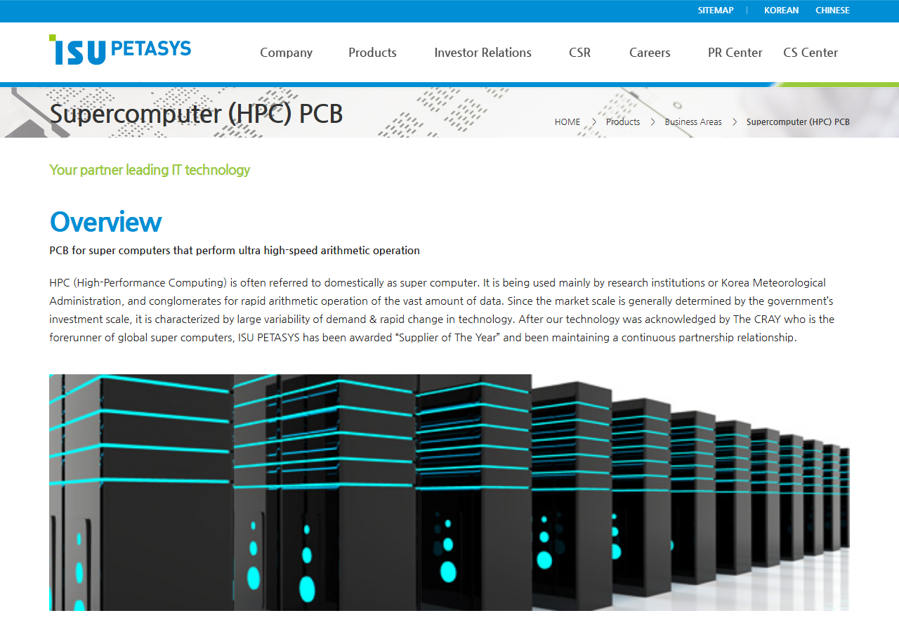 ▶ 서버·스토리지·슈퍼컴퓨터용 PCB : 하이퍼스케일 데이터센터의 서버, 대용량 스토리지, 슈퍼컴퓨터 등에 사용되는 고성능 MLB를 공급합니다. 클라우드 컴퓨팅과 빅데이터 처리 수요 확대에 따라 고집적·고밀도 PCB 수요가 지속 증가하고 있습니다.