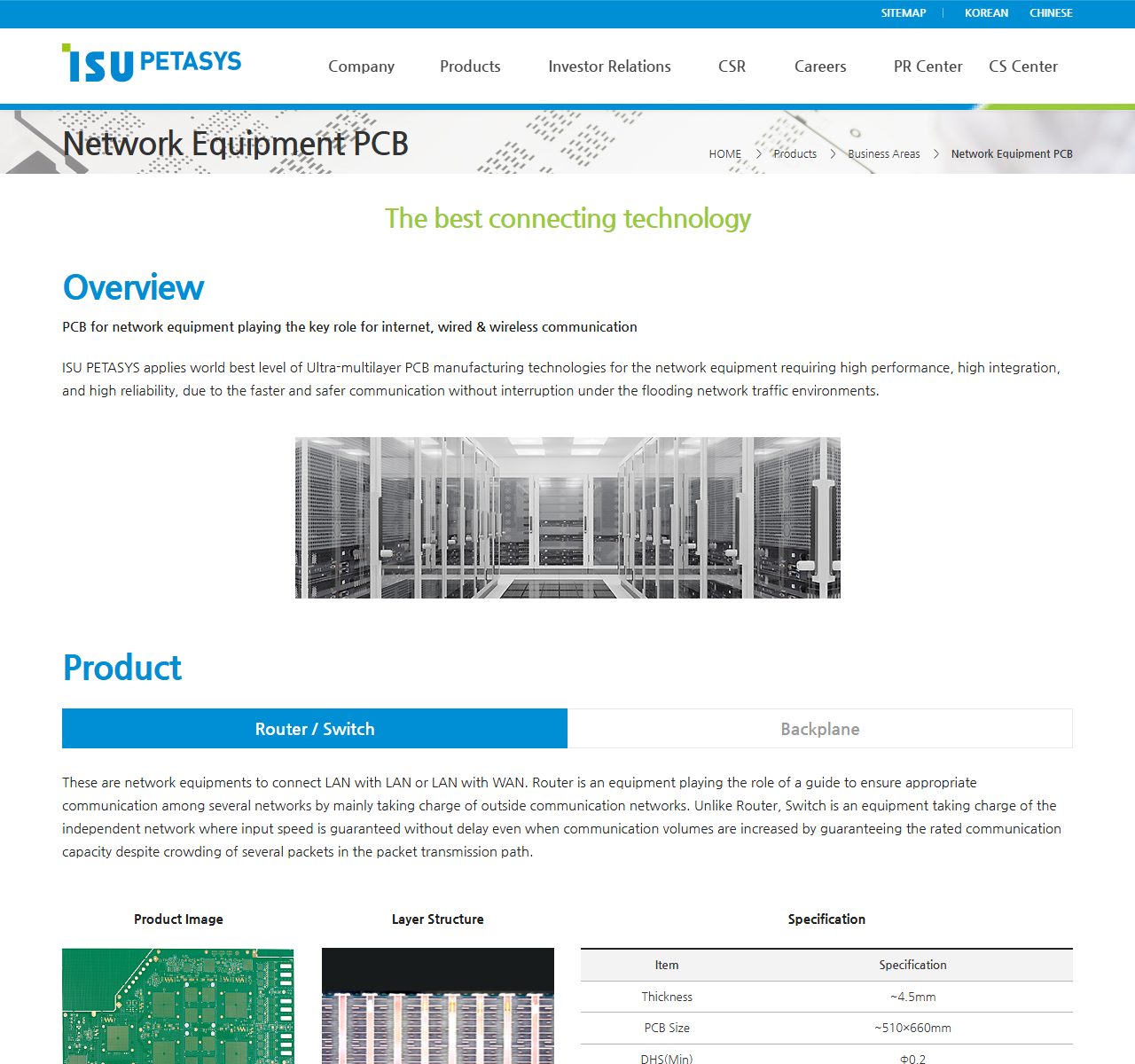 ▶ 초고다층 PCB(MLB) 제조 : 18층 이상 초고다층 인쇄회로기판(MLB)을 전문 생산하며, AI 서버·데이터센터·네트워크 장비에 사용되는 고부가가치 기판을 글로벌 빅테크 기업에 공급합니다.